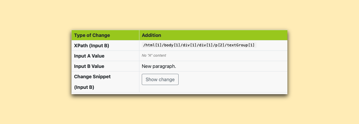 Other significant changes, like added or deleted paragraphs, will also be included in the report. The changed content is included alongside an XPath showing where to find the change in the input, e.g.