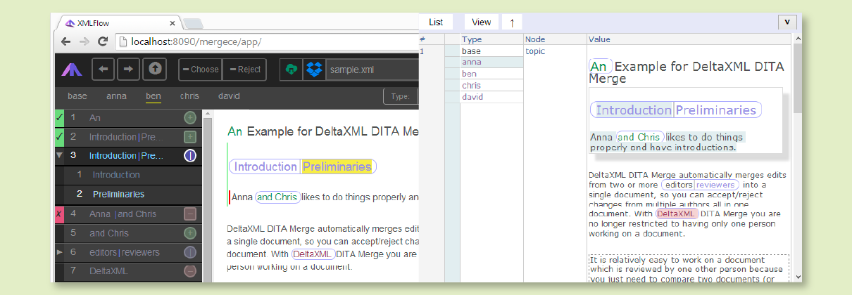 To collate all the revision documents, I used our new DITA Merge solution from DeltaXignia and added the documents returned by anna, ben, chris and david, plus the base document. Using DITA Merge’s Java API I created a simple Java-FX app which allowed me to merge documents by drag and drop from a file-view but I could equally have initiated the process from the command-line without any code.