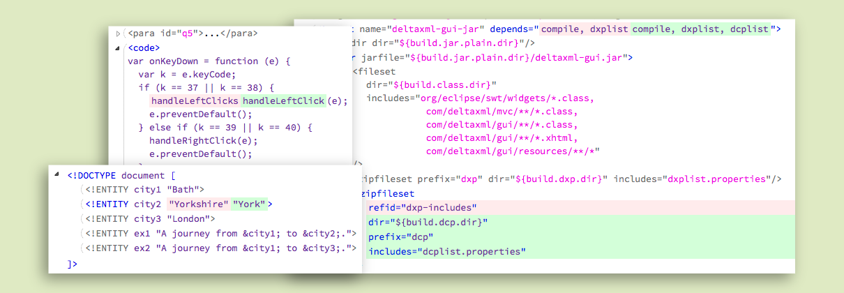Because this is a syntax view, this rendering must be capable of representing lexical content that is not part of the standard XML infoset, this includes CDATA sections and internal DocType subsets. The DiffReport therefore understands the way DeltaXignia’s DeltaV2 format represents these lexical artefacts and converts them back to use the appropriate syntax so that the rendered view shows well-formed XML.