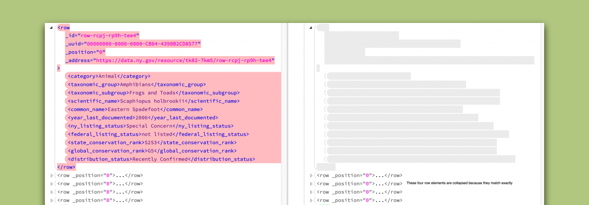 Looking at the public data from the USA: Biodiversity by County – Distribution of Animals, Plants and Natural Communities. (See here ) There was just one file published so I split out the records for two counties, Albany and Yates and decided to compare them. There is a container called with multiple elements each looking like this: