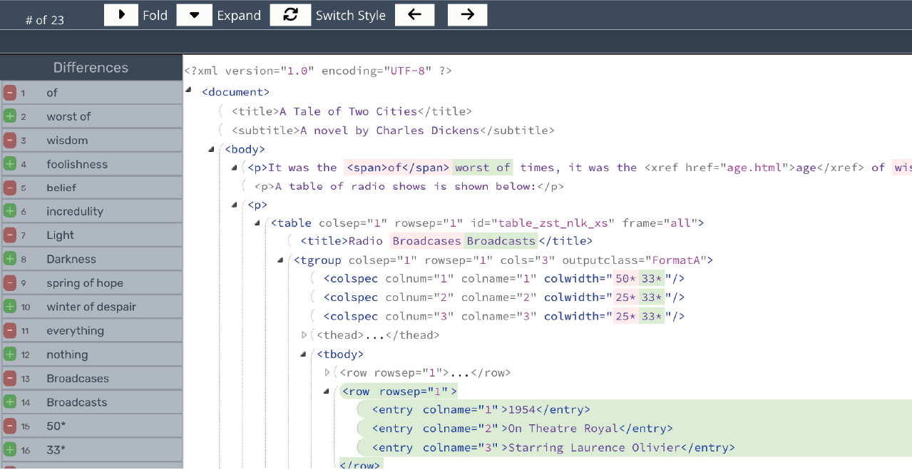 SunExpress also found the flexible configuration especially useful, particularly the ability to exclude elements that they did not want from the comparison. DITA Compare’s configuration ability is one of it’s most powerful features. You can choose to ignore certain elements, find change within referenced images, and even compare CALS and HTML tables. In this case, SunExpress found that the results obtained in table comparisons, provided effective reading for the end users.